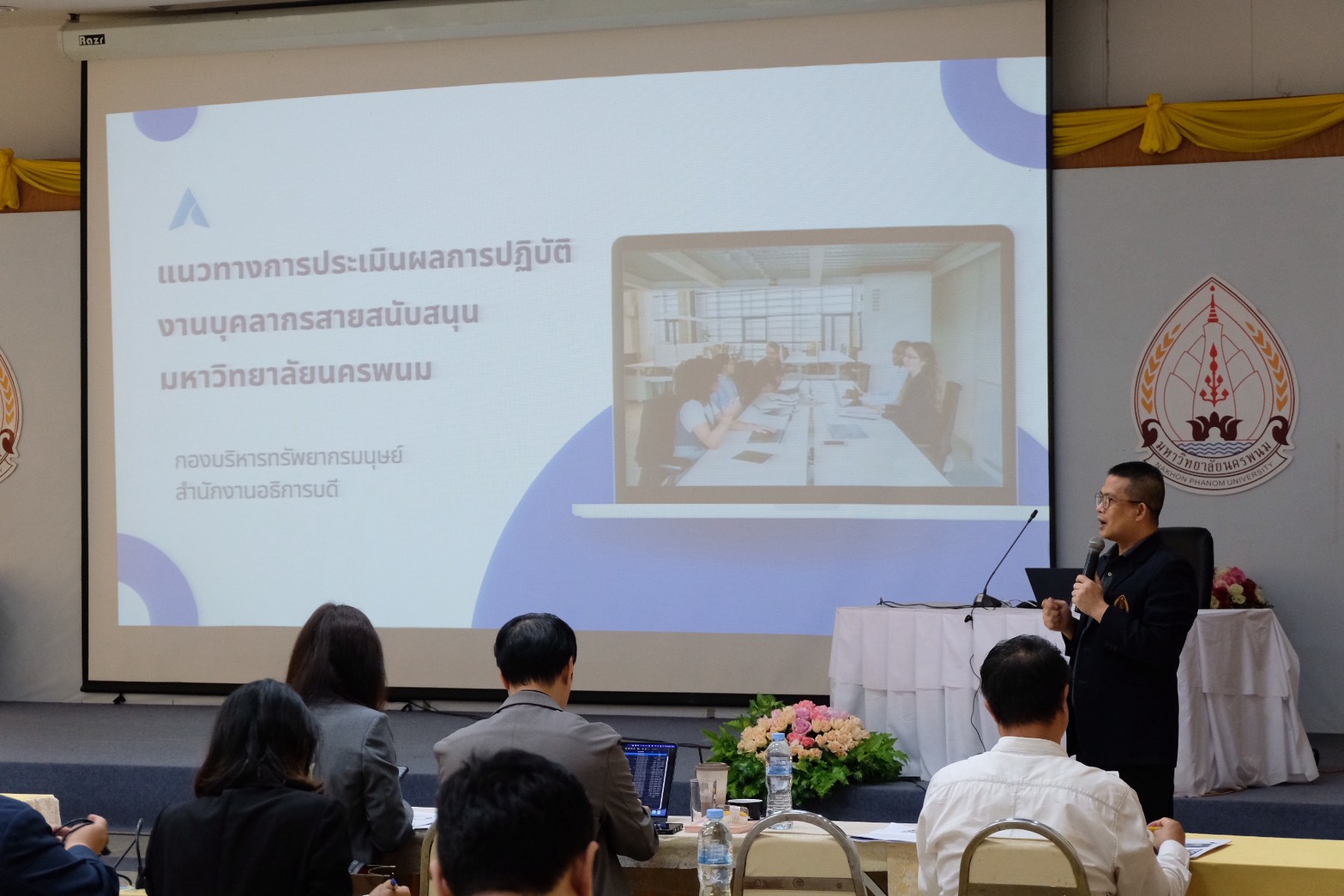 วันที่ 10 พฤศจิกายน 2568 เวลา 13.00 น. ณ ห้องประชุมพนมนาคา ชั้น 5 ตึกสำนักงานอธิการบดี ผู้ช่วยศาสตราจารย์ ดร.ปุณณฑรีย์ เจียวิริยบุญญา คณบดีคณะศิลปศาสตร์และวิทยาศาสตร์ มหาวิทยาลัยนครพนม พร้อมด้วยรองคณบดี หัวหน้าสำนักงานคณบดี และหัวหน้างานบุคลากร เข้าร่วมประชุมแนวทางการประเมินผลการปฏิบัติงานบุคลากรสายสนับสนุน มหาวิทยาลัยนครพนม จัดโดย กองบริหารทรัพยากรมนุษย์ มหาวิทยาลัยนครพนม โดยมีวัตถุประสงค์เพื่อสร้างความเข้าใจที่ถูกต้องเกี่ยวกับหลักเกณฑ์ วิธีการ และเกณฑ์การประเมินผลการปฏิบัติงานของบุคลากรสายสนับสนุนให้เป็นไปในทิศทางเดียวกัน การประชุมในครั้งนี้ได้รับเกียรติจาก รองศาสตราจารย์วิยดา กวานเหียน กลางบุตร เป็นผู้บรรยายและชี้แจงรายละเอียดเกี่ยวกับแนวทางการประเมิน ทั้งในด้านตัวชี้วัดผลการปฏิบัติงาน เกณฑ์การให้คะแนน และกระบวนการติดตามผล เพื่อให้หน่วยงานสามารถนำไปประยุกต์ใช้ในการบริหารงานบุคลากรได้อย่างมีประสิทธิภาพและโปร่งใส การเข้าร่วมประชุมดังกล่าวสะท้อนถึงความมุ่งมั่นของคณะในการพัฒนาระบบบริหารงานบุคคลให้มีมาตรฐาน และส่งเสริมให้บุคลากรสายสนับสนุนมีขวัญกำลังใจและศักยภาพในการทำงานเพิ่มมากขึ้น